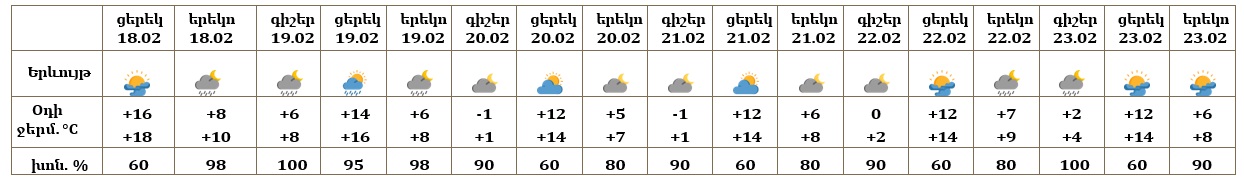 Հանրապետության տարածքում փետրվարի 18-ի կեսօրից հետո, 19-ին, 22-ի ցերեկը, 23-ին առանձին շրջաններում սպասվում են տեղումներ․ նախալեռնային և հովտային շրջաններում՝ անձրևի, լեռնային շրջաններում գիշերը՝ ձյան, ցերեկը՝ ձնախառն անձրևի տեսքով։ Փետրվարի 20-21-ը, 22-ի գիշերը սպասվում է առանց տեղումների եղանակ։