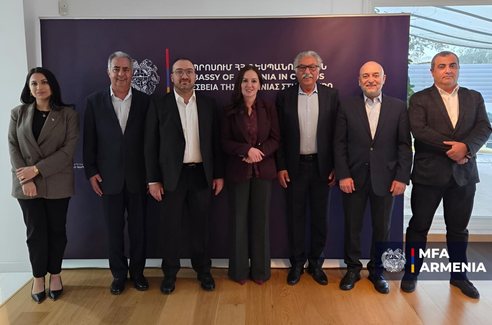 Կիպրոսում ՀՀ դեսպանությունում ՀՀ ԱԳՆ գլխավոր քարտուղար Դավիթ Կարապետյանը հանդիպում է ունեցել ՀԲԸՄ նախագահ Սեմ Սիմոնյանի հետ։