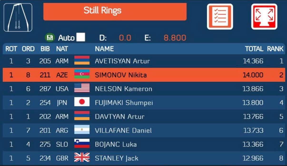 Այսպիսով, օղակների վարժությունում ոսկե մեդալը բաժին է հասել Հայաստանին, արծաթը՝ Ադրբեջանին, իսկ բրոնզը՝ ԱՄՆ-ին։