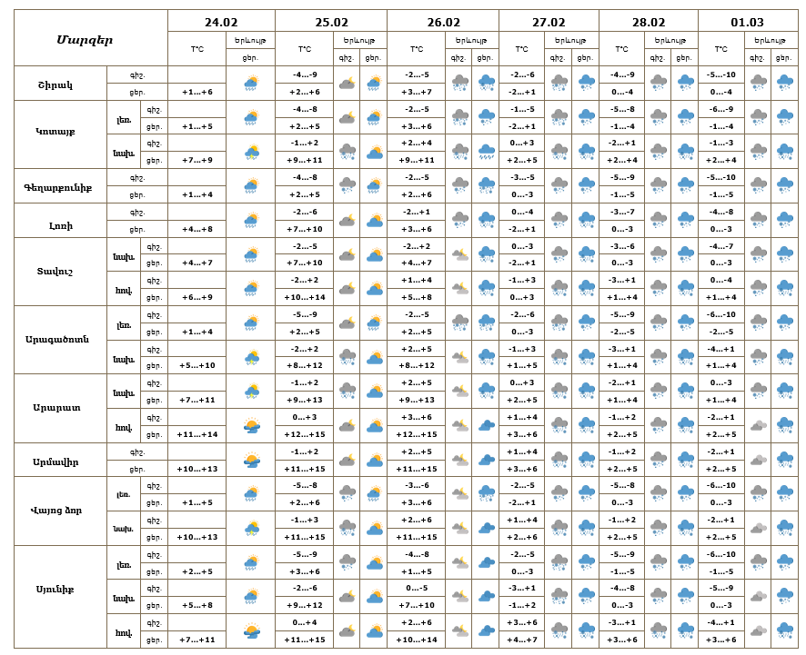 Փետրվարի 26-ի ցերեկը, 27-28-ը, մարտի 1-ին շրջանների զգալի մասում սպասվում են տեղումներ՝ նախալեռնային և հովտային շրջաններում՝ ձնախառն անձրևի, լեռնային շրջաններում՝ ձյան տեսքով, լեռնային առանձին շրջաններում՝ բուք, ցածր հորիզոնական տեսանելիություն։