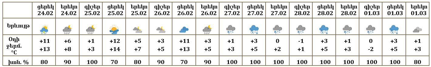 Հանրապետության տարածքում փետրվարի 24-ի ցերեկը, 25-ին, 26-ի գիշերը առանձին շրջաններում սպասվում են տեղումներ՝ նախալեռնային և հովտային շրջաններում՝ անձրևի, լեռնային շրջաններում՝ ձյան և ձնախառն անձրևի տեսքով։