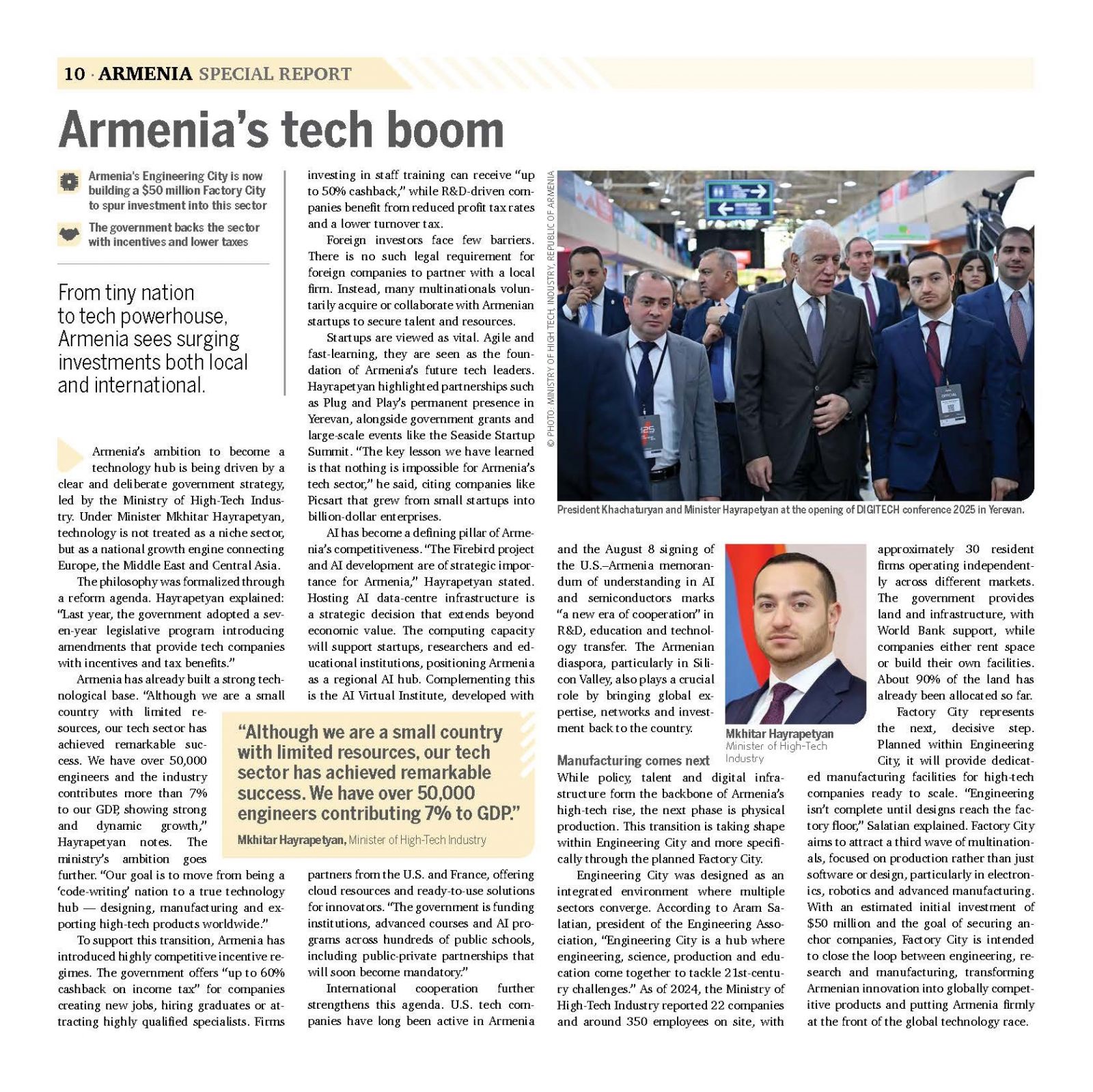 Հայաստանի տեխնոլոգիական ոլորտի զարգացման ռազմավարությունը, արձանագրված առաջընթացն ու առաջիկա նպատակները պարբերականի հետ զրույցում ներկայացրել է ՀՀ բարձր տեխնոլոգիական արդյունաբերության նախարար Մխիթար Հայրապետյանը՝ ընդգծելով, որ երկիրը քայլ առ քայլ վերածվում է տարածաշրջանային տեխնոլոգիական հանգույցի։