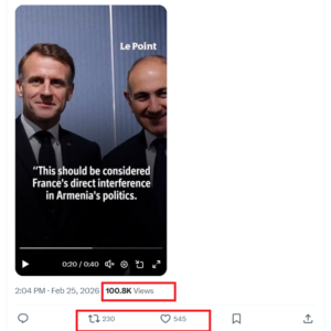 X (Twitter) սոցիալական հարթակում դարձյալ հայաստանյան քաղաքական դաշտը թիրախավորող կեղծ տեղեկություններ են տարածվում։ Առաջին հայացքից բոտային հաշիվը հրապարակել է մի տեսանյութ, որի վրա ֆրանսիական հայտնի պարբերականի անունն է՝ Le Point, իսկ դրա ենթագրերում նշվում է, թե իբրև «Քաղաքացիական պայմանագիր» կուսակցության անդամների 70 տոկոսը դիմել են Ֆրանսիայի քաղաքացիություն ստանալու համար։ «Սա Ֆրանսիայի ուղիղ միջամտությունն է Հայաստանի քաղաքական կյանքին։ Նույն իրավիճակը եղել է նաև Մոլդովայում խորհրդարանական ընտրություններից առաջ»,- FIP.am-ի փոխանցմամբ՝ ասված է տեսանյութի ենթագրերում։ Տեսանյութը X-ում լայն տարածում էր գտել։