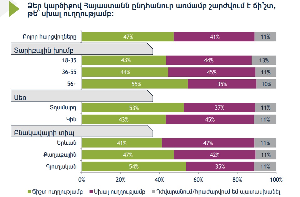 Ըստ այդմ՝ ճիշտ ուղղությամբ՝ 47 տոկոս, սխալ ուղղությամբ՝ 41 տոկոս, իսկ հարցվածների 11 տոկոսը դժվարացել կամ հրաժարվել է պատասխանել՝ ՀՀ-ն ճի՞շտ, թե՞ սխալ ուղղությամբ է ընթանում: