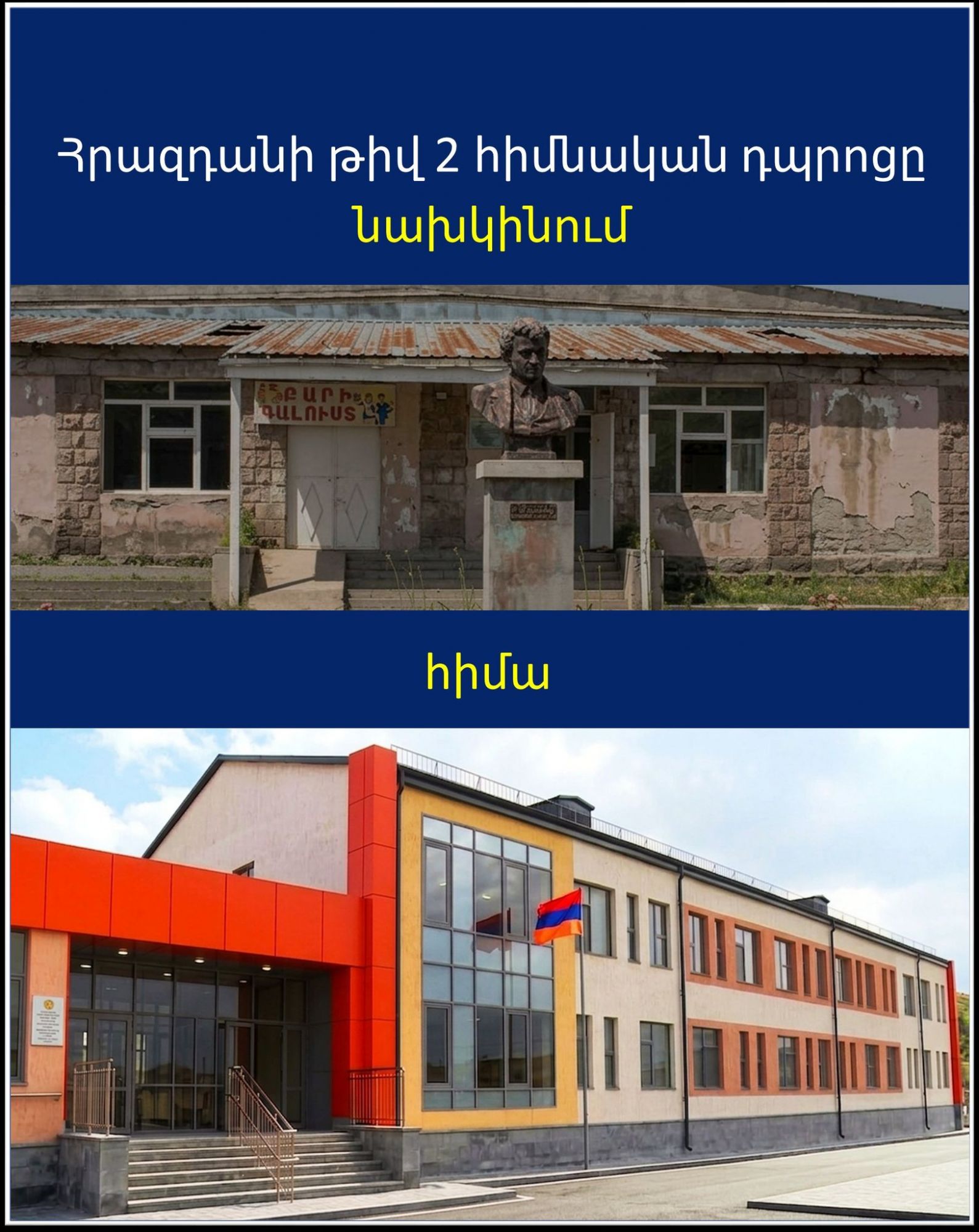 Հայաստանի Հանրապետության վարչապետի աշխատակազմի ղեկավարի տեղակալ Տարոն Չախոյանը սոցցանցի իր էջում հրապարակել է Հրազդանի թիվ 2 հիմնական դպրոցի շենքի լուսանկարը նախկինում և ներկայում: