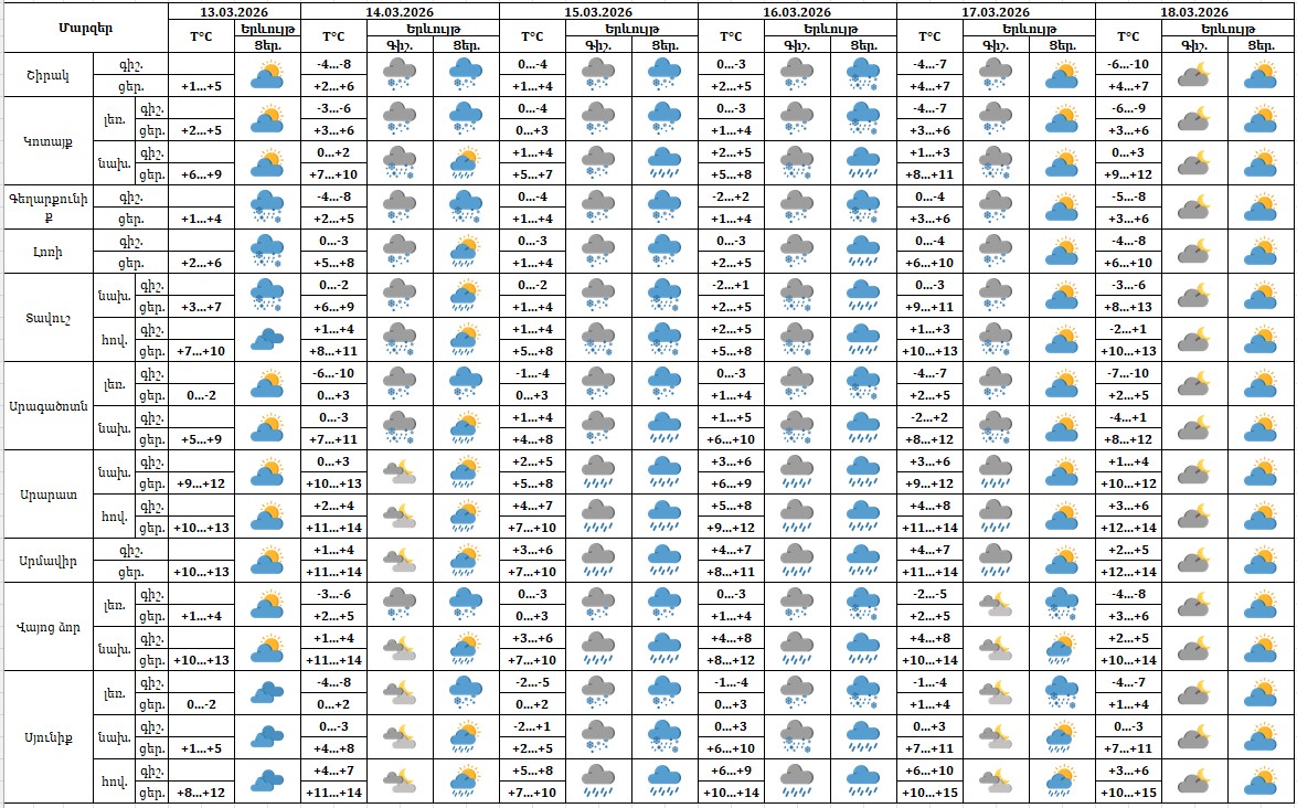 Մարտի 13-ի ցերեկը, 14-ին, 17-ին՝ հանրապետության առանձին շրջաններում, 15-16-ը՝ շրջանների մեծ մասում սպասվում են տեղումներ, լեռնային գոտիներում՝ ձյան, նախալեռնային և հովտային գոտիներում՝ ձնախառն անձրևի և անձրևի տեսքով։ Մարտի 15-16-ը առանձին հատվածներում տեղումները կլինեն զգալի։