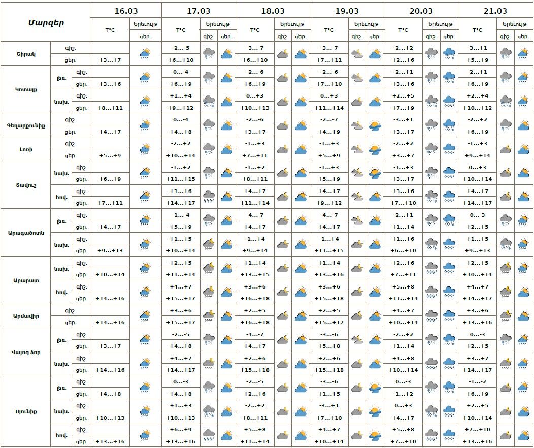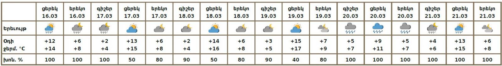 Հանրապետության տարածքում մարտի 16-ի ցերեկը, 17-ի գիշերը, 20-ին ժամանակ առ ժամանակ`շրջանների մեծ մասում, 21-ին առանձին շրջաններում սպասվում են տեղումներ. լեռնային գոտիներում՝ ձյան, նախալեռնային և հովտային գոտիներում՝ անձրևի տեսքով։ Լեռնային շրջաններում սպասվում են նաև բուք, ցածր հորիզոնական տեսանելիություն, ավտոճանապարհներին՝ մերկասառույց։ Մարտի 17-ի ցերեկը, 18-19-ը սպասվում է առանց տեղումների եղանակ։