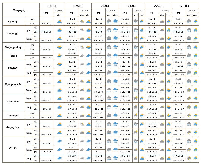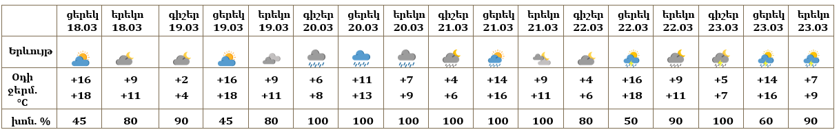 Հանրապետության տարածքում մարտի 18-ի ցերեկը, 19-ին, 22-ի գիշերը սպասվում է առանց տեղումների եղանակ։ Մարտի 20-ին ժամանակ առ ժամանակ`շրջանների մեծ մասում, 21-ին, 22-ի ցերեկը, 23-ին առանձին շրջաններում սպասվում են տեղումներ. լեռնային գոտիներում՝ թաց ձյան, նախալեռնային և հովտային գոտիներում՝ անձրևի տեսքով։ Առանձին վայրերում հնարավոր է ամպրոպ։
