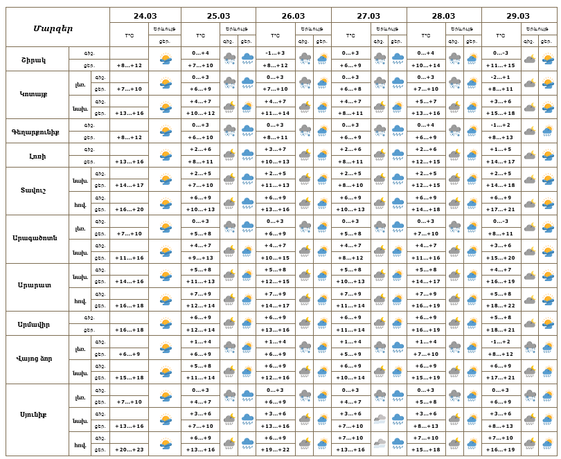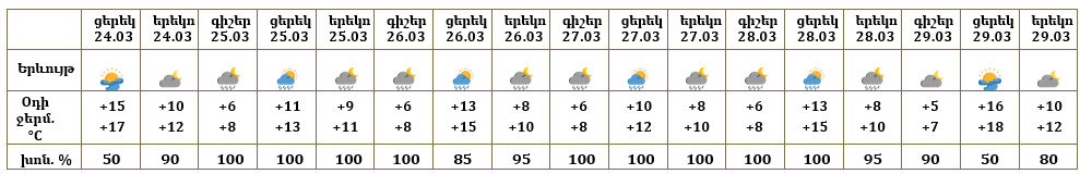Հանրապետության տարածքում մարտի 24-ի ցերեկը սպասվում է առանց տեղումների եղանակ։ Մարտի 25-28-ը շրջանների մեծ մասում ժամանակ առ ժամանակ, 29-ին առանձին շրջաններում սպասվում են տեղումներ. լեռնային գոտիներում՝ թաց ձյան, նախալեռնային և հովտային գոտիներում՝ անձրևի տեսքով։