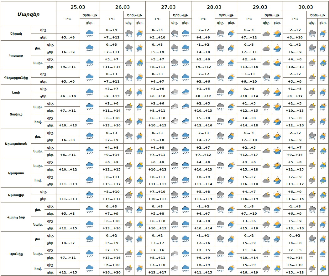 Մարտի 25-ի ցերեկը, 26-28-ը, 30-ին շրջանների մեծ մասում ժամանակ առ ժամանակ, 29-ին առանձին շրջաններում սպասվում են տեղումներ. լեռնային գոտիներում՝ թաց ձյան, նախալեռնային և հովտային գոտիներում՝ անձրևի տեսքով։ Առանձին վայրերում հնարավոր է նաև ամպրոպ։