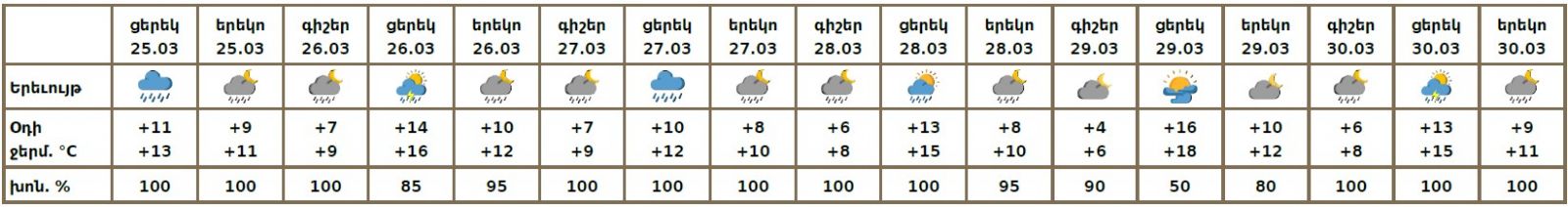Երևանում մարտի 25-ի ցերեկը, 26-28-ը, 30-ին ժամանակ առ ժամանակ սպասվում է անձրև։ Մարտի 26-ին և 30-ին հնարավոր է նաև ամպրոպ, ամպրոպի ժամանակ սպասվում է նաև քամու ուժգնացում՝ 12-15 մ/վ արագությամբ: