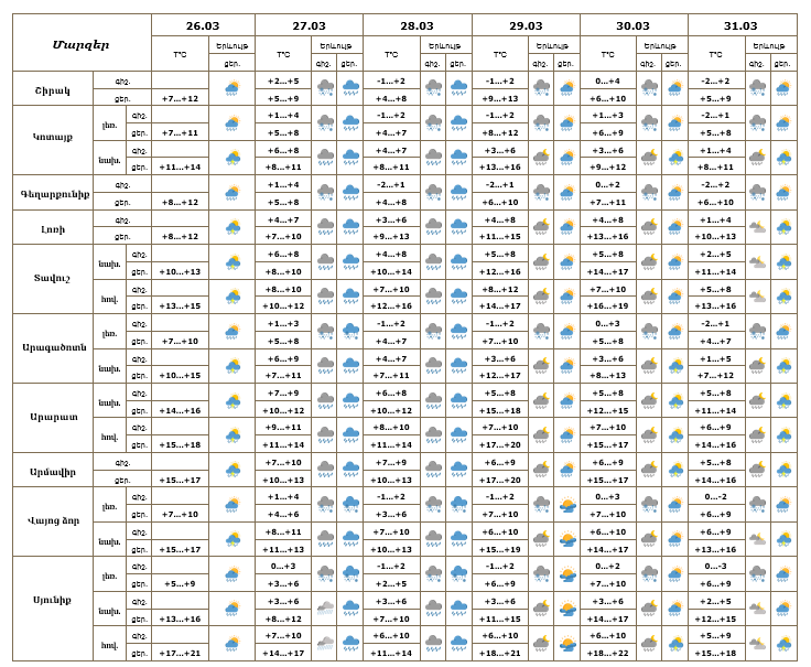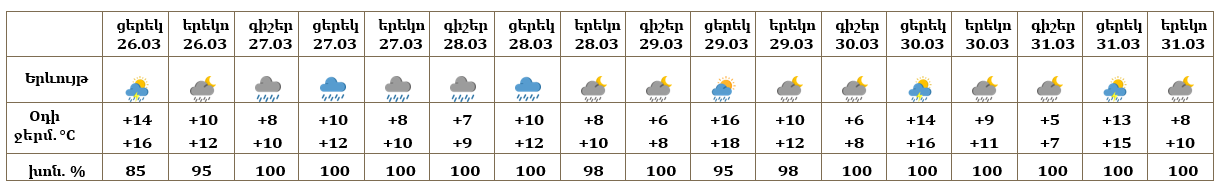 Հանրապետության տարածքում մարտի 26-ի ցերեկը, 27-31-ը շրջանների մեծ մասում ժամանակ առ ժամանակ սպասվում են տեղումներ. լեռնային գոտիներում՝ թաց ձյան, նախալեռնային և հովտային գոտիներում՝ անձրևի տեսքով։ Մարտի 27-ին Սյունիքում և առանձին լեռնային շրջաններում տեղումները կլինեն զգալի, ուղեկցվելով ցածր հորիզոնական տեսանելիությամբ։ Մարտի 26-ի ցերեկը, 30-31-ն առանձին վայրերում հնարավոր է նաև ամպրոպ։