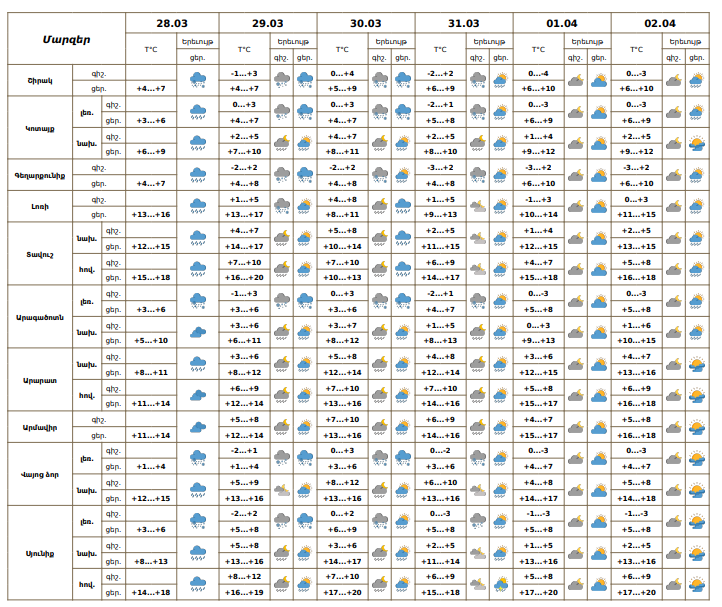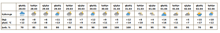 Հանրապետության տարածքում մարտի 28-ի ցերեկը, 29-31-ին, ապրիլի 2-ի ցերեկը ժամանակ առ ժամանակ շրջանների զգալի մասում սպասվում են տեղումներ. լեռնային գոտիներում՝ թաց ձյան, նախալեռնային և հովտային գոտիներում՝ անձրևի տեսքով։