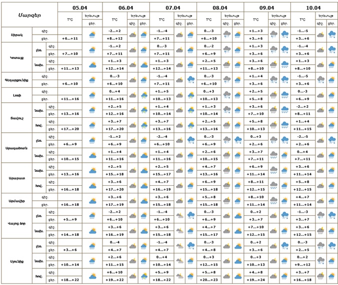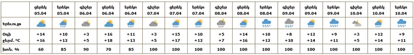 Հանրապետության տարածքում ապրիլի 5-ի, 6-ի և 7-ի ցերեկը, 8-10-ը ժամանակ առ ժամանակ առանձին շրջաններում սպասվում են տեղումներ. լեռնային գոտիներում՝ ձյան և թաց ձյան, նախալեռնային և հովտային գոտիներում՝ անձրևի տեսքով։ Ապրիլի 6-ի և 7-ի գիշերը սպասվում է առանց տեղումների եղանակ։