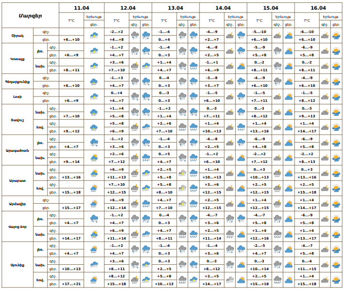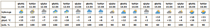 Հանրապետության տարածքում ապրիլի 11-ի ցերեկը, 12-13-ը ժամանակ առ ժամանակ շրջանների զգալի մասում, 14-ին, 15-ի գիշերն առանձին շրջաններում սպասվում են տեղումներ. առանձին վայրերում՝ առատ։