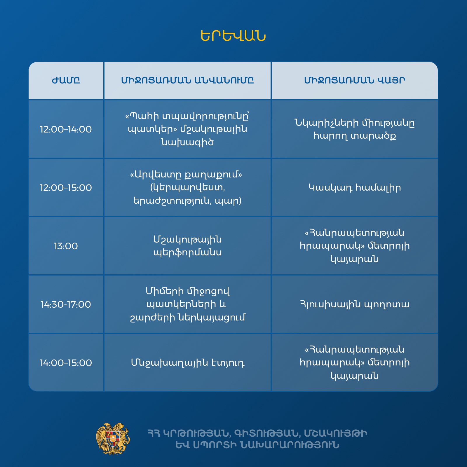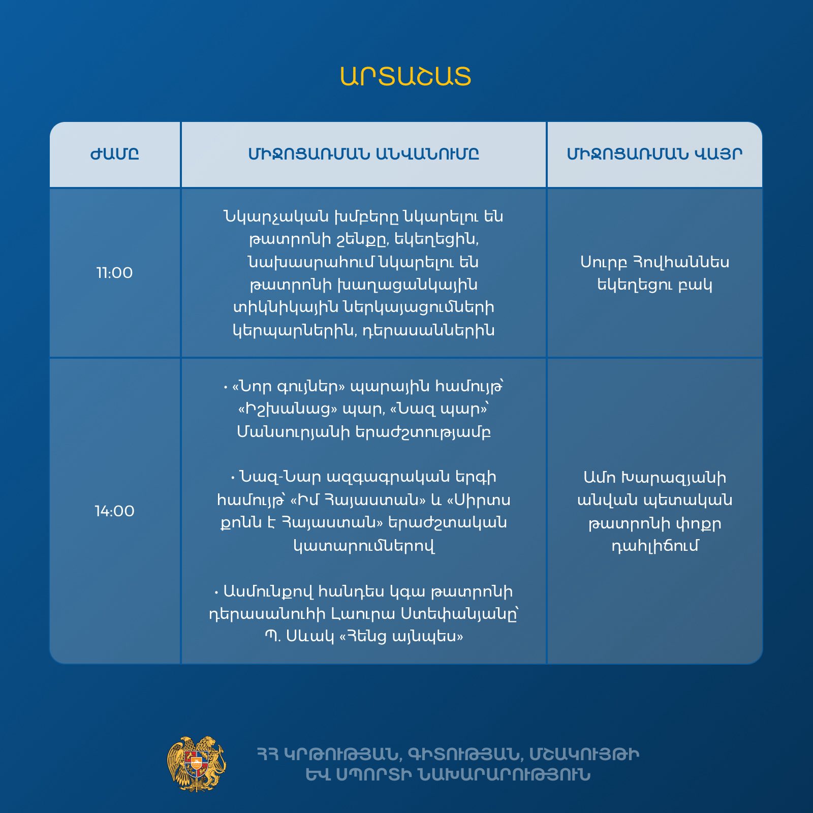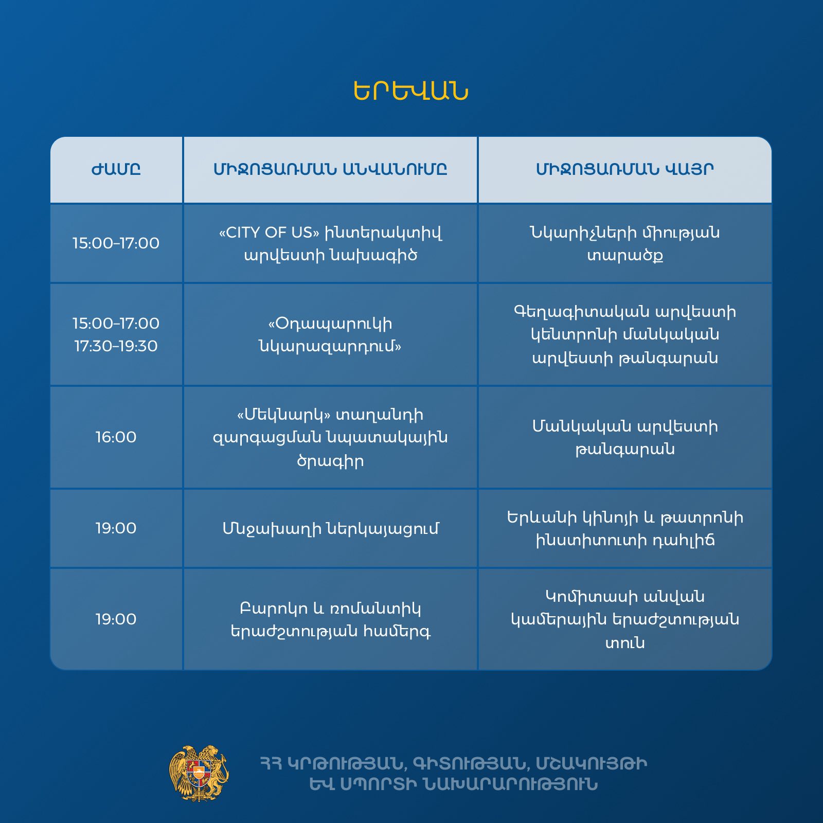 ԿԳՄՍ նախարարությունը Արվեստի օրվա շրջանակում Երևանում, Արտաշատում և Վանաձորում նախաձեռնել է բազմաժանր մշակութային միջոցառումներ․ տեղի կունենան համերգային ծրագրեր, թատերական և մնջախաղային ներկայացումներ, ցուցահանդեսներ, բացօթյա արվեստի ակցիաներ, ինտերակտիվ նախագծեր և ստեղծագործական այլ նախաձեռնություններ։