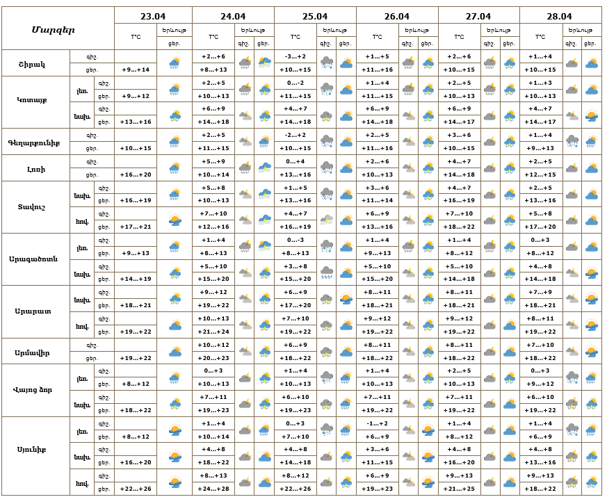 Հանրապետության տարածքում ապրիլի 23-ի ցերեկը, 24-28-ը առանձին շրջաններում ժամանակ առ ժամանակ սպասվում է անձրև և ամպրոպ, առանձին հատվածներում հնարավոր է նաև կարկուտ: Ապրիլի 24-ի ցերեկը և 25-ի գիշերն առանձին շրջաններում տեղումները կլինեն ինտենսիվ։ Ապրիլի 25-ին և 28-ին տեղումները լեռնային շրջաններում գիշերը և առավոտյան ժամերին կլինեն թաց ձյան տեսքով։