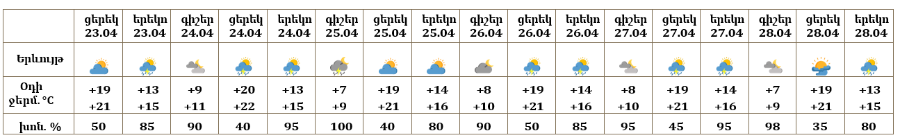 Երևան քաղաքում ապրիլի 23-ի կեսօրից հետո, 24-ին, 25-ի գիշերը, 26-28-ի կեսօրից հետո սպասվում է անձրև և ամպրոպ, ամպրոպի ժամանակ՝ քամու ուժգնացում՝ մինչև 16-19 մ/վ արագությամբ։ Ապրիլի 25-ի ցերեկը, 26-ի գիշերը սպասվում է առանց տեղումների եղանակ։