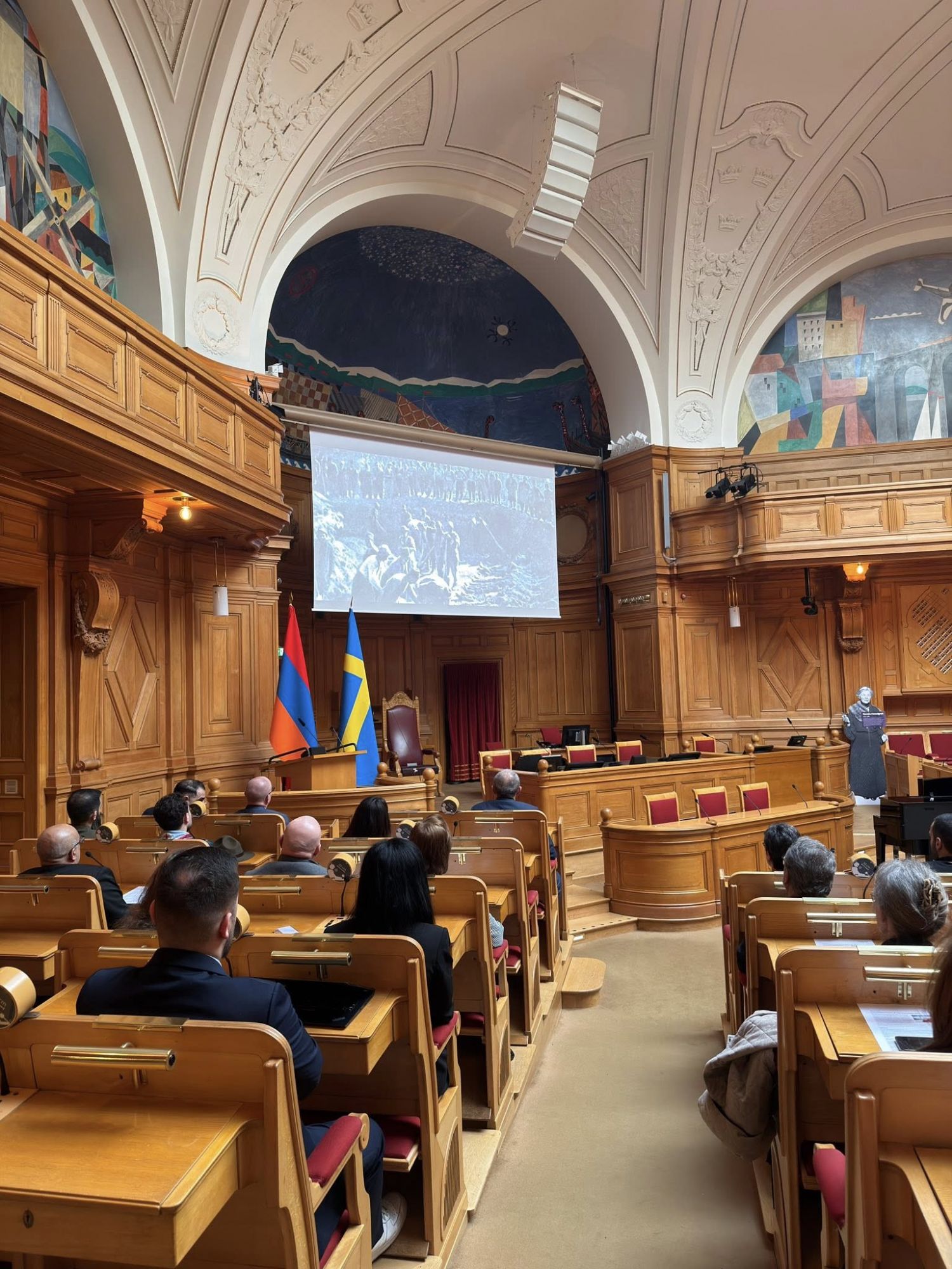 Հնչեց հայկական երաժշտություն և ցուցադրվեց «Փրկության քարտեզը» վավերագրական ֆիլմը։ Ելույթներով հանդես եկան դեսպան Աննա Աղաջանյանը, Ռիկսդագի պատգամավորներ Բյորն Սյոդերը և Արին Կարապետը՝ անդրադառնալով ապագա ոճրագործությունների կանխարգելման մեր համատեղ պատասխանատվությանը։