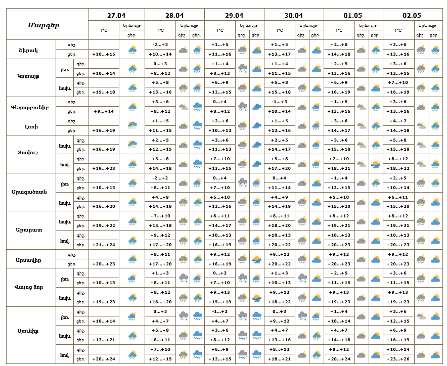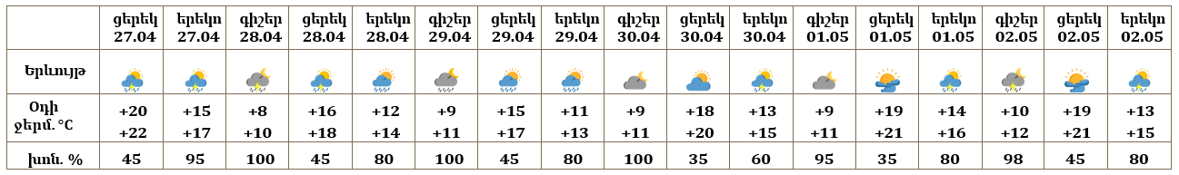 Հանրապետության տարածքում ապրիլի 27-ի ցերեկը, 28-30-ը և մայիսի 1-2-ն առանձին շրջաններում սպասվում են կարճատև անձրև և ամպրոպ, տեղ-տեղ հնարավոր է կարկուտ: Ապրիլի 27-ի ցերեկն առանձին հատվածներում տեղումները կլինեն ինտենսիվ։ Ապրիլի 28-ի և 29-ի գիշերը լեռնային շրջաններում տեղումները կլինեն թաց ձյան տեսքով։
